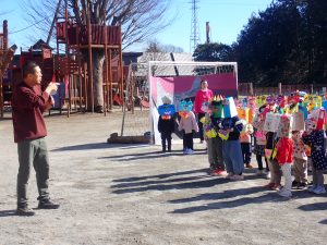 一番小さい赤ちゃんクラスのお友だちも 可愛いお面をつけて お話を聞いていました!